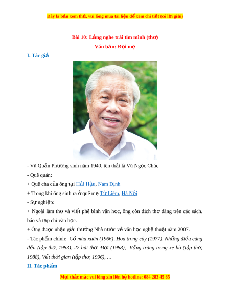 Bài 10: Lắng nghe trái tim mình (th ) ơ Văn bản: Đ i ợ mẹ I. Tác giả - Vũ Qu n Ph ầ ư ng ơ sinh năm 1940, tên th t ậ là Vũ Ng c ọ Chúc - Quê quán: + Quê cha c a ông t ủ i ạ H i ả H u ậ , Nam Định
