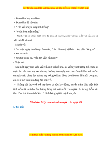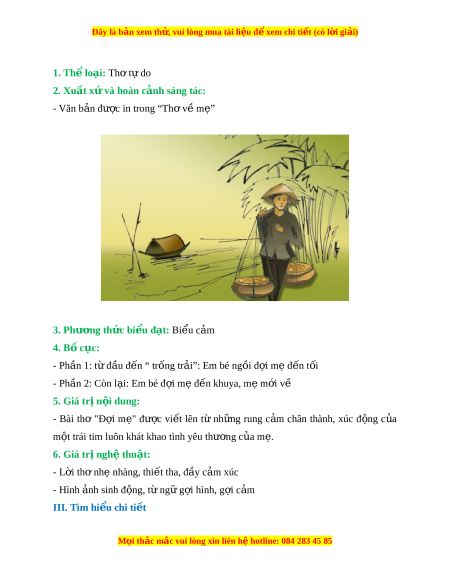 Đây là bản xem th , vu ử i lòng mua tài li u ệ đ xe ể m chi ti t (c ế ó l i ờ gi i ả ) 1. Th l ể oại: Th t ơ do ự 2. Xuất x và hoàn c ứ nh s ả áng tác: - Văn b n đ ả ư c ợ in trong “Th v ơ m ề ” ẹ 3. Phư ng ơ th c bi ứ u đ ể t ạ : Bi u ể c m ả 4. B c ố ục: - Ph n 1: ầ t đ ừ u đ ầ n “ ế tr ng t ố r i ả ”: Em bé ng i ồ đ i ợ m đ ẹ n t ế i ố - Ph n 2: ầ Còn l i ạ : Em bé đ i ợ m đ ẹ n khuya, m ế m ẹ i ớ về 5. Giá tr n ị i ộ dung: - Bài thơ "Đ i ợ m " ẹ đư c ợ vi t ế lên từ nh ng ữ rung c m ả chân thành, xúc đ ng ộ c a ủ m t