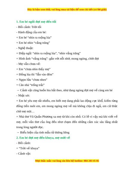 Đây là bản xem th , vu ử i lòng mua tài li u ệ đ xe ể m chi ti t (c ế ó l i ờ gi i ả ) 1. Em bé ng i ồ đ i ợ m đ ẹ n t ế i ố - Bối c nh: ả Tr i ờ tối - Hành đ ng c ộ a ủ em bé: + Em bé “nhìn ra ru ng l ộ úa” + Em bé nhìn “v ng t ầ răng” - Ngh t ệ hu t ậ : + Đi p ng ệ : ữ “nhìn ra ru ng l ộ úa”, “nhìn v ng t ầ răng” + Hình nh ả “v ng t ầ răng”: g n ắ v i ớ n i ỗ nh , m ớ ong ngóng, ch i ờ đ i ợ - Mẹ vẫn ch a v ư : ề + Em “ch a nhì ư n th y m ấ ” ẹ