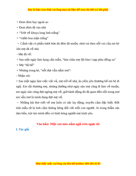 Đây là bản xem th , vu ử i lòng mua tài li u ệ đ xe ể m chi ti t (c ế ó l i ờ gi i ả ) + Đom đóm bay ngoài ao + Đom đóm đã vào nhà + “Tr i ờ v khuya l ề ung linh tr ng” ắ + “vư n ờ hoa m n t ậ r ng” ắ → C nh ả v t ậ có ph n ầ tư i ơ h n ơ dù đêm đã mu n, ộ nh ư vui theo n i ỗ vui c a ủ em bé khi m đã v ẹ nhà ề - Mẹ đã v : ề + Sau m t ộ ngày làm l ng ụ c n m ầ n, “bàn chân ẫ m l ẹ i ộ bùn ì o p phí ạ a đ ng xa” ồ + Mẹ “đã b ” ế + Nh ng t ư rong bé, “n i ỗ đ i ợ v n n ẫ m ằ m ”: ơ - Nh n xét ậ : + Sau m t ộ ngày làm vi c v ệ t ấ v , ả m t ẹ r v ở nhà, âu ề y m ế yêu thư ng b ơ em ế bé đi ng . ủ Em r t ấ thư ng ơ m , ẹ nh ng ư dư ng ờ nh ư ngày nào m ẹ cũng đi làm v ề mu n, ộ em ngày nào cũng đ i ợ ngóng m v ẹ , gi ề hành đ ờ ng ộ đó đã quen đ n n ế i ỗ trong mơ em vẫn m l ơ à mình đang đ i ợ m v ẹ . ề → Nh ng ữ bài thơ vi t ế về mẹ luôn có s c ứ lay đ ng, ộ truy n ề c m ả đ c ặ bi t ệ . B i ở tình m u ẫ tử là tình c m ả thiêng liêng đ i ố v i ớ m i ỗ con ngư i ờ . Ai trong th m ẳ sâu