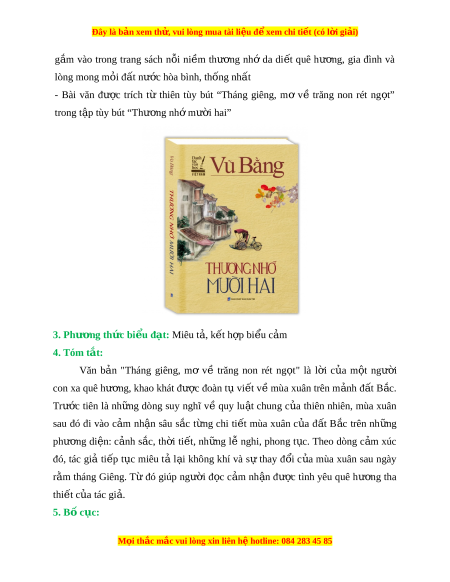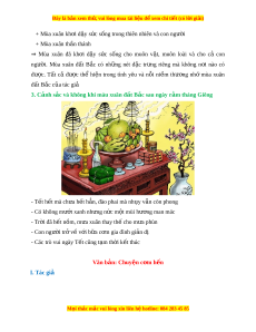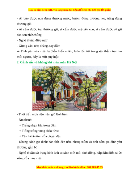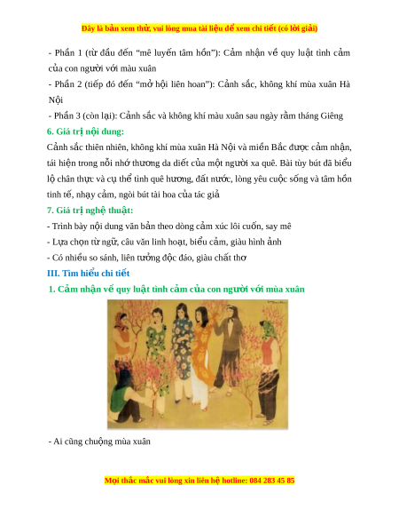Đây là bản xem th , vu ử i lòng mua tài li u ệ đ xe ể m chi ti t (c ế ó l i ờ gi i ả ) - Ph n ầ 1 (từ đ u ầ đ n ế “mê luy n ế tâm h n”) ồ : C m ả nh n ậ về quy lu t ậ tình c m ả c a ủ con ngư i ờ v i ớ màu xuân - Ph n ầ 2 (ti p ế đó đ n ế “mở h i ộ liên hoan”): C nh ả s c, ắ không khí mùa xuân Hà N i ộ - Ph n 3 ( ầ còn l i ạ ): C nh ả s c và không khí ắ màu xuân sau ngày r m ằ tháng Giêng 6. Giá tr n ị i ộ dung: C nh ả s c