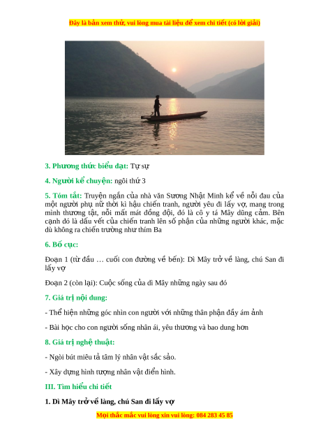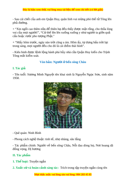 ậ Huy, quân linh vui m ng phò t ừ h t ế ư Tông lên ph đ u ư ng. ơ + “Xin ng i ồ cao thêm n a ư đ t ể hiên h đ ạ u t ề h y đ ấ ư c ơ m t ă r ng, cho t ồ h a o lòng vui c a u m i o ngư i ơ !”, “C t ứ h l ế ên lên xu ng xu ố ng y nh ố ng ư ư i ơ ta gi n qu ơ ả cầu ho c ă rư c pho t ớ ư ng Ph ơ t ậ ." + “Mấy hôm trư c, ớ ngay nao tr i ơ cung u am. Hôm y ấ , t d ự ng b ư u t ầ r i ơ l i ạ trong sang, m i o ngư i ơ đ u cho đó l ề a cai đi m ề thai bình”. - Kiêu binh đư c ơ l nh l ệ ng ộ hanh pha h y nha c u a Q ư u n H ậ uy ki n cho ế Trinh Tông mất ki m ể soat. Văn bản: Ngư i ờ b ở n s ế ông Châu I. Tác giả - Tên tu i ô : Sư ng ơ Minh Nguy t ệ tên khai sinh la Nguy n ê Ng c o S n, ơ sinh năm 1958. - Quê quan: Ninh Bình - Phong cach ngh t ệ hu t ậ : tinh t , nh ế nhang, s ẹ âu l ng ă - Tac ph m ẩ chinh: Ngư i ơ về b n ế sông Châu, N i ô đau dòng h , o N i ơ hoang da đồng v ng, D o i hư ng ơ II. Tác ph m ẩ 1. Th l