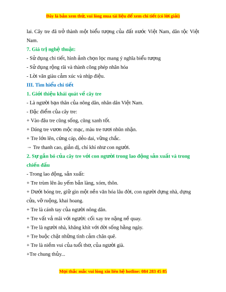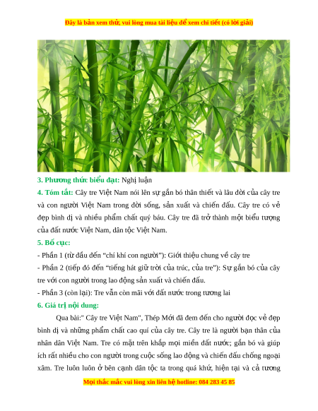 Đây là bản xem th , vu ử i lòng mua tài li u ệ đ xe ể m chi ti t (c ế ó l i ờ gi i ả ) 3. Phư ng ơ th c bi ứ u đ ể t ạ : Nghị lu n ậ 4. Tóm t t ắ : Cây tre Vi t ệ Nam nói lên sự g n ắ bó thân thi t ế và lâu đ i ờ c a ủ cây tre và con ngư i ờ Vi t ệ Nam trong đ i ờ s ng, ố s n ả xu t ấ và chi n ế đ u. ấ Cây tre có vẻ đẹp bình dị và nhi u ề ph m ẩ ch t