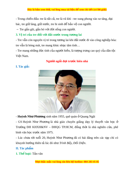 ẫ à bóng mát, tre mang khúc nh c t ạ âm tình… - Tre mang nh ng đ ữ c t ứ ính c a ủ ngư i ờ hi n, l ề à tư ng t ợ r ng cao quý c ư a ủ dân t c ộ Việt Nam. Ngư i ờ ng i ồ đ i ợ trư c hi ớ ên nhà I. Tác gi : ả - Huỳnh Nh P ư hư ng
