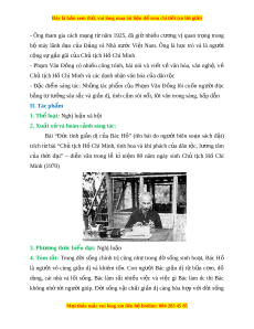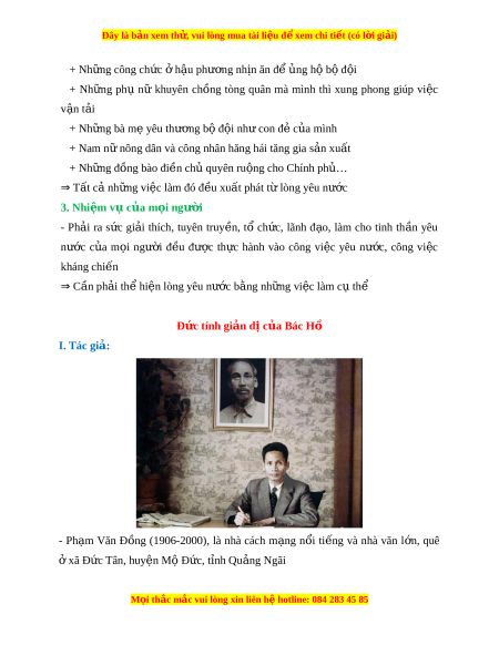 + Nam nữ nông dân và công nhân hăng hái tăng gia s n ả xu t ấ + Nh ng đ ữ ồng bào đi n ch ề ủ quyên ru ng ộ cho Chính ph … ủ ⇒ T t ấ c nh ả ng vi ữ ệc làm đó đ u xu ề t ấ phát t l ừ òng yêu nư c ớ 3. Nhi m ệ v c ụ a m ủ i ọ ngư i ờ - Ph i ả ra s c ứ gi i ả thích, tuyên truy n, ề tổ ch c, ứ lãnh đ o, ạ làm cho tinh th n ầ yêu nư c ớ c a ủ m i ọ ngư i ờ đ u ề đư c ợ th c ự hành vào công vi c ệ yêu nư c, ớ công vi c ệ kháng chi n ế ⇒ Cần ph i ả th hi ể n l ệ òng yêu nư c ớ b ng nh ằ ng ữ vi c l ệ àm cụ thể Đức tính giản d c ị a B ủ ác Hồ I. Tác gi : ả - Ph m ạ Văn Đ ng