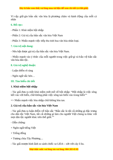 Đây là bản xem th , vu ử i lòng mua tài li u ệ đ xe ể m chi ti t (c ế ó l i ờ gi i ả ) Vì v y ậ gi ữ gìn b n a s c ă văn hóa la phư ng ơ châm va hanh đ ng ộ c a ủ m i ô cá nhân 6. B c ố ục: - Ph n 1: â Khái ni m ê h i ộ nh p ậ - Ph n 2: â Giá tr c ị a b ủ n a s c ă văn hóa Vi t ê Nam - Ph n 3: â Nh n m â nh a vi c ê ti p