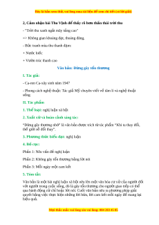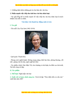 ế thu tinh hoa văn hóa nhân lo i a . 7. Giá tr n ị i ộ dung: - Nêu b t ậ đư c gi ơ á tr c ị a ủ b n s a c ă văn hóa Vi t ê Nam. - Nh n â m nh a vao ý th c ư c a ủ m i ô ngư i ờ trong vi c ê gi ữ gì va b o a v ê b n a s c ă văn hóa dân t c. ộ 8. Giá tr ngh ị t ệ hu t ậ : - Lu n ậ đi m ê ro rang - Ngôn ng s ữ c ben… ă III. Tìm hi u chi ể ti t ế 1. Khái ni m ệ h i ộ nh p ậ - Tác gi a đ a ư ra m t ộ khái ni m ê m i ơ m e v ê h i ộ nh p: ậ “H i ộ nh p ậ la vi c ê sông k t ế vao v i ơ bi n, ch ê không ph ư i a vi c s ê ông tan bi n vao t ế rong bi n" ê ” => Nh n m â nh vi a c hoa nh ê p ậ ch không hoa t ư an. 2. Giá tr c ị a b u n s ả c ắ văn hóa Vi t ệ Nam - Tác gi a đ a ư ra lu n ậ đi m ê v ê b n a s c ă “B n a s c ă la t t â c a nh ng ữ gì đ c ă tr ng ư cho dân t c ộ Vi t ê Nam, t t â c a nh ng ữ gì lam cho ngư i ờ Vi t ê chung ta khác v i ơ m i o dân t c ng ộ ư i ờ khác trên th gi ế i ơ ."” - Dân ch ng: ư + Ngôn ng t ữ i ng ế Vi t ê + Trống đông + Tư ng ơ chua Tây Phư ng.... ơ - Tác gi m a ư n hì ơ nh nh s a o sánh chi c xe L ế ch – x ế t ơ v i ơ cây ô liu. M i ọ thắc m c