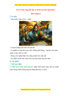 - Trần Quốc Tuấn (1231 – 1300) - Là danh tư ng ớ ki t ệ xu t ấ c a dân ủ t c. ộ - Là ngư i ờ có công l n t ớ rong cu c ộ ch ng quân M ố ông – Nguyên xâm lư c ợ nư c t ớ a năm 1285 và 1287. - Phong cách ngh t ệ hu t ậ : hào s ng, ả m nh m ạ , ch ẽ t ặ ch ẽ - Tác phẩm chính: Đ i ạ Vi t ệ s kí ử toàn th , B ư inh th y ư u l ế ư c ợ II. Tác ph m ẩ 1. Thể loại: Hịch 2. Xuất x và hoà ứ n c nh s ả áng tác: đư c ợ Trần Quốc Tuấn vi t ế vào trư c ớ cu c kháng ộ chi n ch ế
