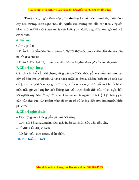 ờ khác. Giá mà anh ta nghiên c u ứ th t ậ kỹ nh ng ư yêu cần cần đ t ạ c a ủ s n ả ph m ẩ mình đã ch n ọ thì sẽ không đ n ế n i ỗ làm ngư i ờ khác phì cư i ờ . 8. Giá tr ngh ị t ệ hu t ậ : – Xây d ng hì ự nh tư ng g ợ n gũi ầ v i ớ đ i ờ s ng. ố – Cách nói b ng ng ằ ụ ngôn, cách giáo hu n t ấ nhi ự ên, đ c ộ đáo, đ c s ặ c. ắ – S d ử ng ụ ẩn d , s ụ o sánh. – L i ờ k ng ể n ắ g n nh ọ ng t ư hâm thúy. III. Tìm hi u chi ể ti t ế M i