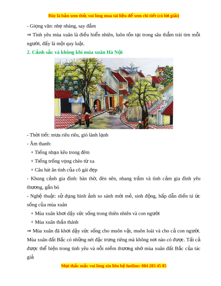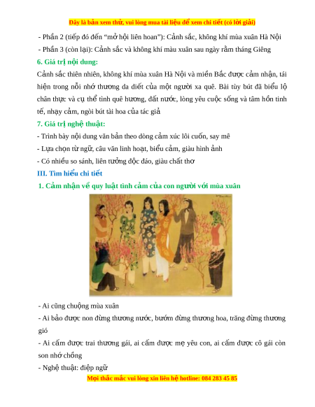 ự và cụ thể tình quê hư ng, ơ đ t ấ nư c, ớ lòng yêu cu c ộ s ng ố và tâm h n ồ tinh t , nh ế y ạ c m ả , ngòi bút tài hoa c a ủ tác gi ả 7. Giá tr ngh ị t ệ hu t ậ : - Trình bày n i ộ dung văn b n t ả heo dòng c m ả xúc lôi cu n, s ố ay mê - L a ch ự n t ọ ng ừ , câu ữ văn linh ho t ạ , bi u c ể m ả , giàu hình nh ả - Có nhi u s ề o sánh, liên tư ng đ ở c đáo, gi ộ àu ch t ấ th ơ III. Tìm hi u chi ể ti t ế 1. Cảm nhận v quy l ề u t ậ tình c m ả c a con ng ủ ư i ờ v i ớ mùa xuân - Ai cũng chu ng ộ mùa xuân - Ai b o ả đư c ợ non đ ng t ừ hư ng ơ nư c, ớ bư m ớ đ ng ừ thư ng ơ hoa, trăng đ ng ừ thư ng ơ gió - Ai c m ấ đư c ợ trai thư ng ơ gái, ai c m ấ đư c ợ mẹ yêu con, ai c m ấ đư c ợ cô gái còn son nh ch ớ ồng - Ngh t ệ hu t ậ : đi p ng ệ ữ M i