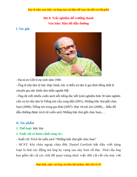 Đây là bản xem th , vu ử i lòng mua tài li u ệ đ xe ể m chi ti t (c ế ó l i ờ gi i ả ) Bài 8: Trải nghi m ệ đ t ể rư ng t ở hành Văn bản: B n đ ả d ồ n đ ẫ ư ng ờ I. Tác gi : ả - Đa-ni-en G t ố -li-ep sinh năm 1946 - Ông là nhà tâm lý h c ọ th c ự hành, bác sĩ đi u t ề r t ị âm lí gia đình đ ng t ồ h i ờ là chuyên gia s c ứ kh e t ỏ âm th n ng ầ ư i ờ M . ỹ - Ông đã vi t ế nhi u cu ề ốn sách n i ổ ti ng đúc ế k t ế kinh nghi m ệ h n ơ 30 năm nghiên c u ứ và t v ư ấn tâm là Ti ng nói ế c a xung đ ủ t ộ (2001), Nh ng b ữ c t ứ h g ư i ử cháu Sam (2006), Ti ng