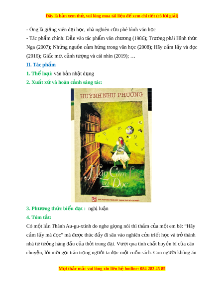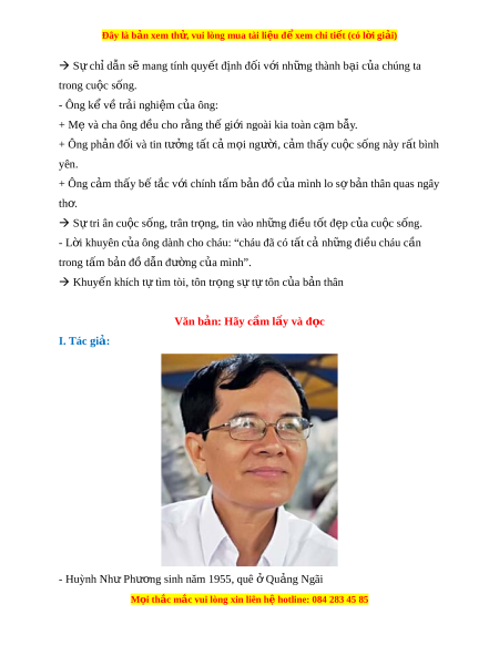 ỉ dẫn sẽ mang tính quy t ế đ nh đ ị i ố v i ớ nh ng t ữ hành b i ạ c a ủ chúng ta trong cu c s ộ ống. - Ông k v ể t ề r i ả nghi m ệ c a ông: ủ + Mẹ và cha ông đ u cho r ề ng t ằ hế gi i ớ ngoài kia toàn c m ạ b y ẫ . + Ông ph n ả đ i ố và tin tư ng ở t t ấ c m ả i ọ ngư i ờ , c m ả th y cu ấ c s ộ ng này ố r t ấ bình yên. + Ông c m ả th y b ấ t ế c v ắ i ớ chính t m ấ b n ả đ c ồ a ủ mình lo s b ợ n ả thân quas ngây th . ơ S t ự ri ân cu c s ộ ống, trân tr ng, t ọ in vào nh ng đi ữ u t ề t ố đ p c ẹ a cu ủ c ộ s ng. ố - L i ờ khuyên c a ông dành cho ủ cháu: “cháu đã có t t ấ cả nh ng đi ữ u cháu c ề n ầ trong tấm b n ả đ d ồ n đ ẫ ư ng ờ c a m ủ ình”. Khuy n ế khích t t ự ìm tòi, tôn tr ng s ọ t ự t ự ôn c a b ủ n ả thân Văn bản: Hãy c m ầ l y và đ ấ c ọ I. Tác gi : ả - Huỳnh Nh Ph ư ư ng s ơ inh năm 1955, quê Q ở u ng ả Ngãi M i