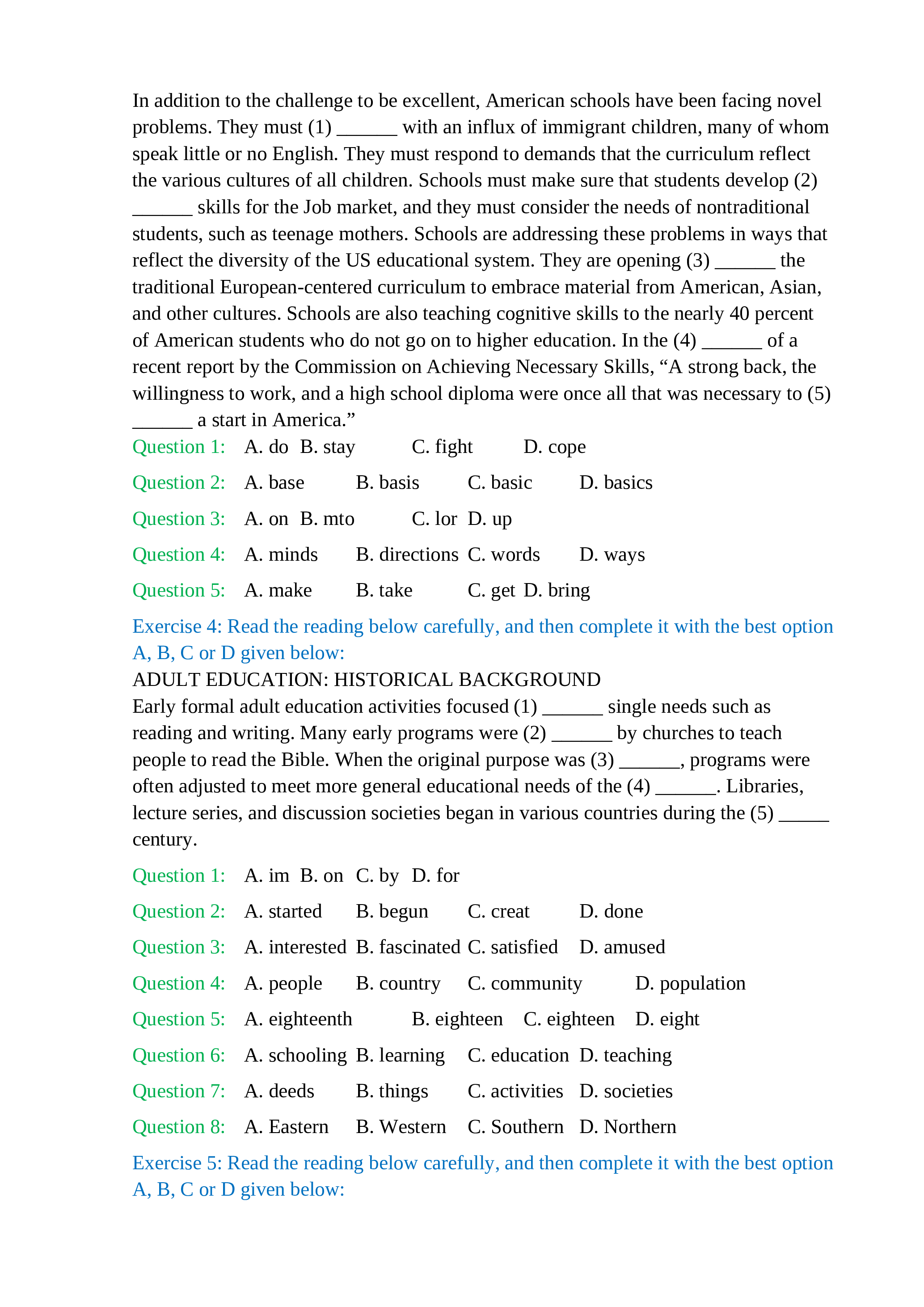 willingness to work, and a high school diploma were once all that was necessary to (5) ______ a start in America.” Question 1: A. do B. stay C. fight D. cope Question 2: A. base B. basis C. basic D. basics Question 3: A. on B. mto C. lor D. up Question 4: A. minds B. directions C. words D. ways Question 5: A. make B. take C. get D. bring