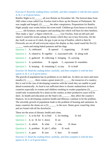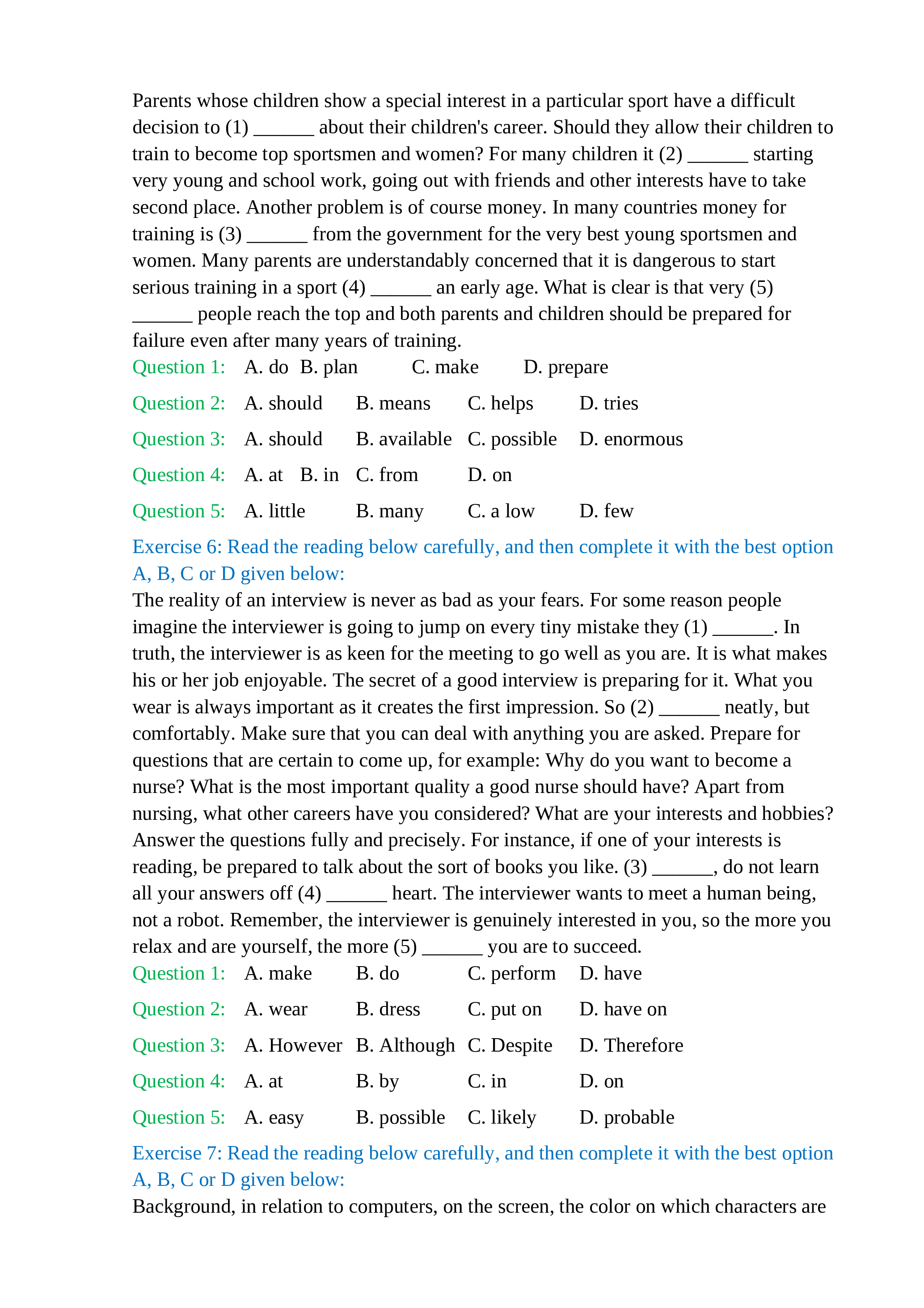 Exercise 7: Read the reading below carefully, and then complete it with the best option A, B, C or D given below: