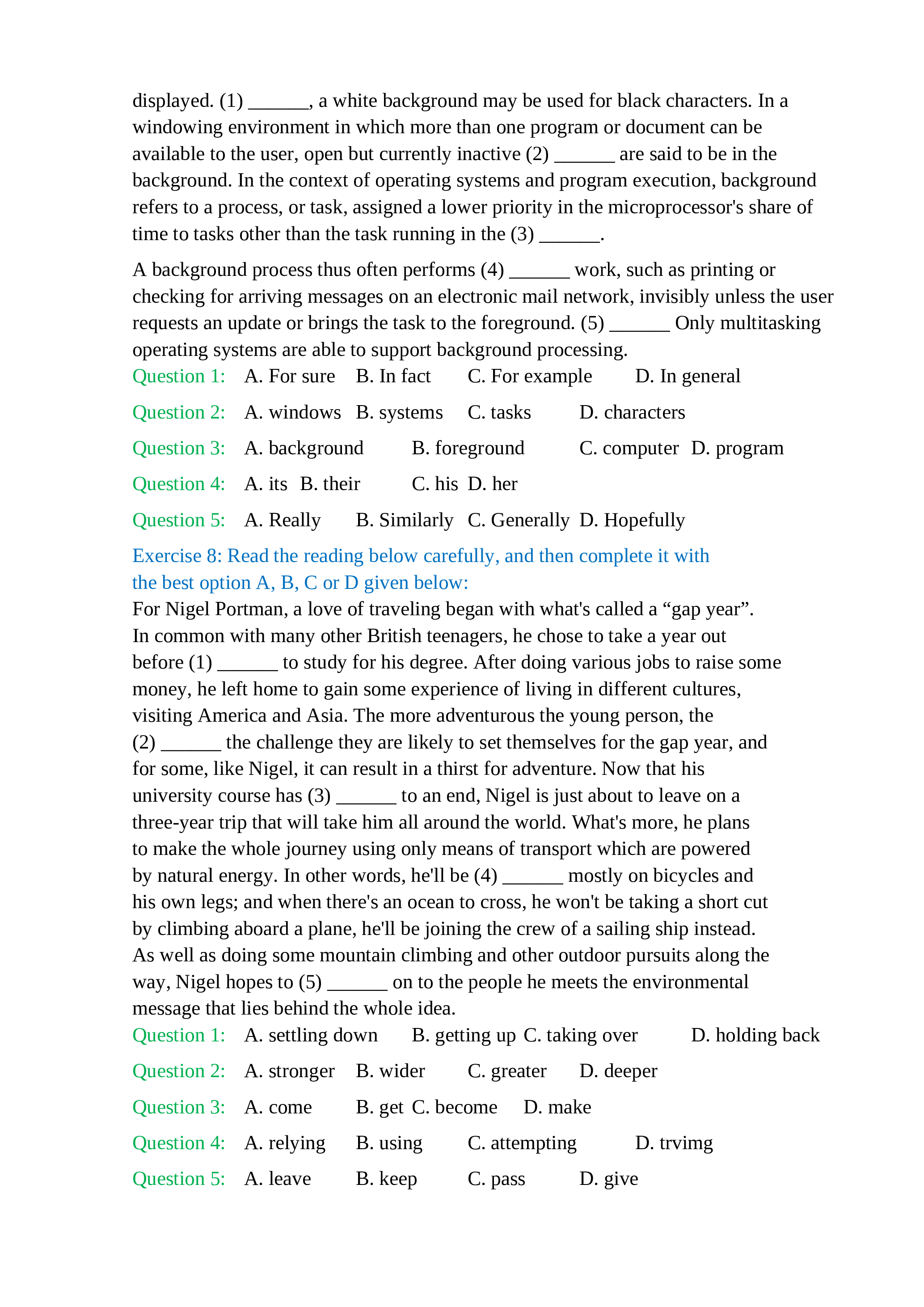 Question 2: A. windows B. systems C. tasks D. characters Question 3: A. background B. foreground C. computer D. program Question 4: A. its B. their C. his D. her Question 5: A. Really