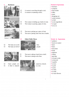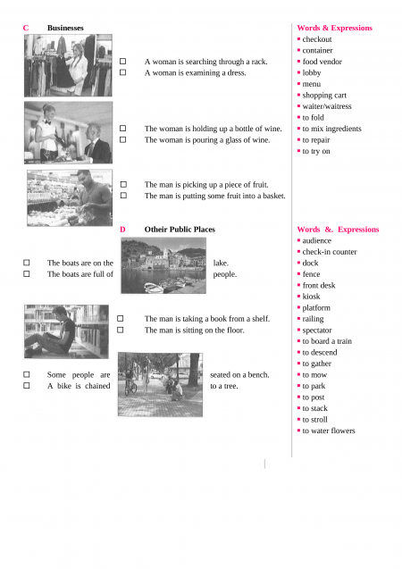 The man is putting some fruit into a basket. D Otheir Public Places Words &. Expressions audience check-in counter The boats are on the lake. dock The boats are full of people. fence front desk kiosk platform