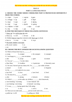 I. CHOOSE THE WORD WHOSE UNDERLINED PART IS PRONOUNCED DIFFERENTLY FROM THE OTHERS: 1. a. alone b. over c. women d.open 2. a. teenage b. sat c. add d. black 3. a. burn b. turn c. curl d. during 4. a. bed b. get c. decide d. setting 5. a. children b. child c. mike d. wild 6. a. hut b. shut c. put d. cut