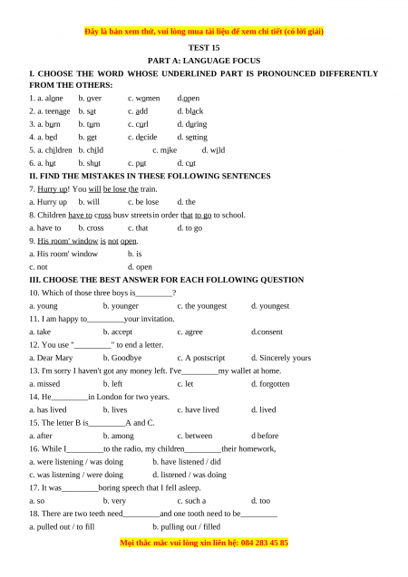 Test 15 - Bộ đề bồi dưỡng học sinh giỏi tiếng Anh toàn diện lớp 6 - Giáo viên Linh Đan
