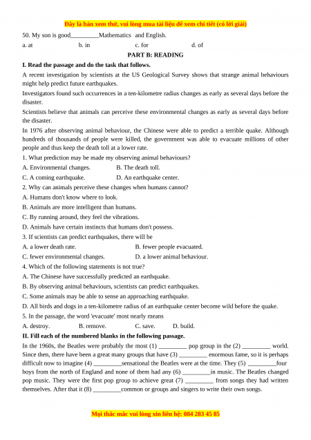 50. My son is good_________Mathematics and English. a. at b. in c. for d. of PART B: READING