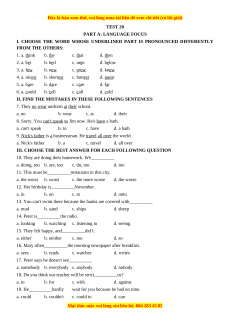I. CHOOSE THE WORD WHOSE UNDERLINED PART IS PRONOUNCED DIFFERENTLY FROM THE OTHERS: 1. a. think b. the c. that d. then 2. a. bet b. bed c. men d. below 3. a. few b. new c. grew d. knew 4. a. nicest b. shortest c. hottest d. guest 5. a. bare b. dare c. care d. far 6. a. could b. cell c. call d. cold