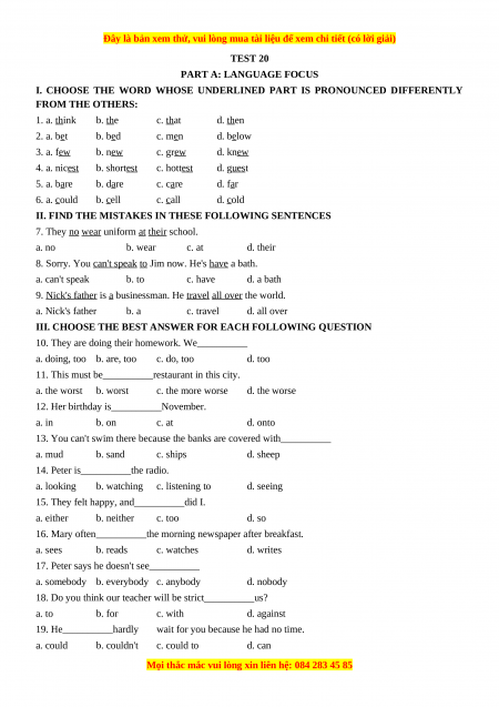 Test 20 - Bộ đề bồi dưỡng học sinh giỏi tiếng Anh toàn diện lớp 6 - Giáo viên Linh Đan
