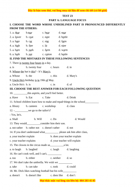 Test 23 - Bộ đề bồi dưỡng học sinh giỏi tiếng Anh toàn diện lớp 6 - Giáo viên Linh Đan