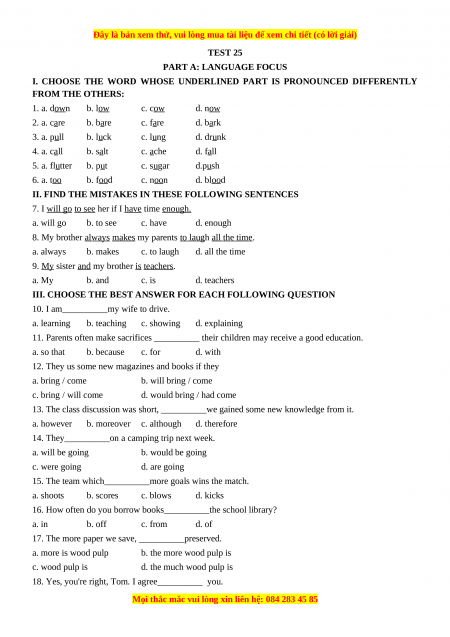 Test 25 - Bộ đề bồi dưỡng học sinh giỏi tiếng Anh toàn diện lớp 6 - Giáo viên Linh Đan