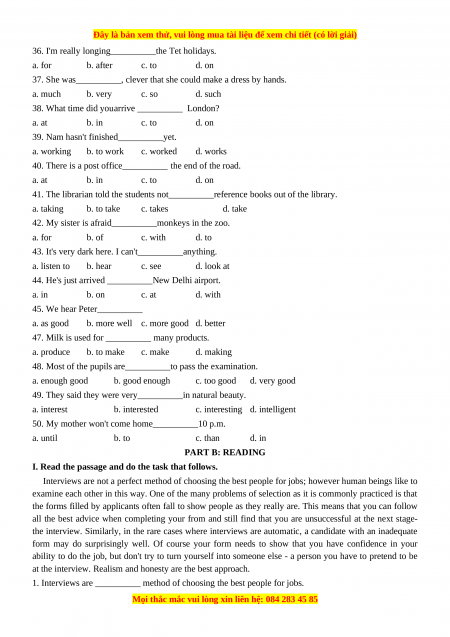 36. I'm really longing__________the Tet holidays. a. for b. after c. to d. on