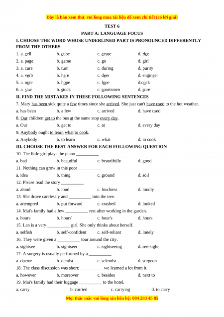 Test 6 - Bộ đề bồi dưỡng học sinh giỏi tiếng Anh toàn diện lớp 6 - Giáo viên Linh Đan