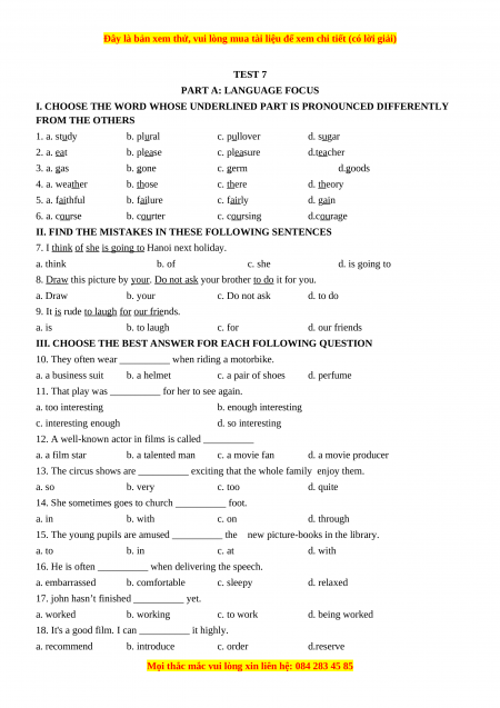 Test 7 - Bộ đề bồi dưỡng học sinh giỏi tiếng Anh toàn diện lớp 6 - Giáo viên Linh Đan
