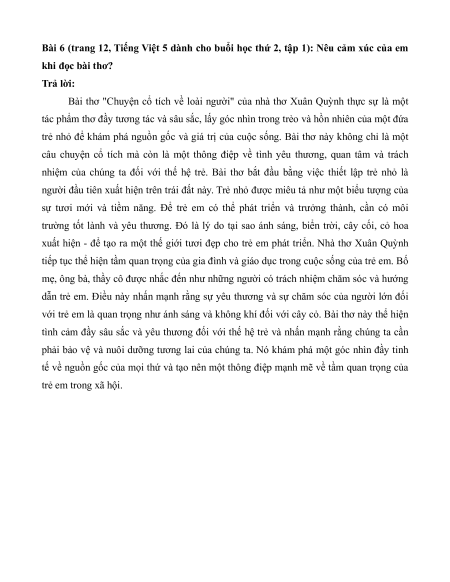Bài 6 (trang 4, Tiếng Việt 5 dành cho buổi học thứ 2, tập 1): Em thích hình ảnh nào trong bài đọc? Vì sao? Trả lời: