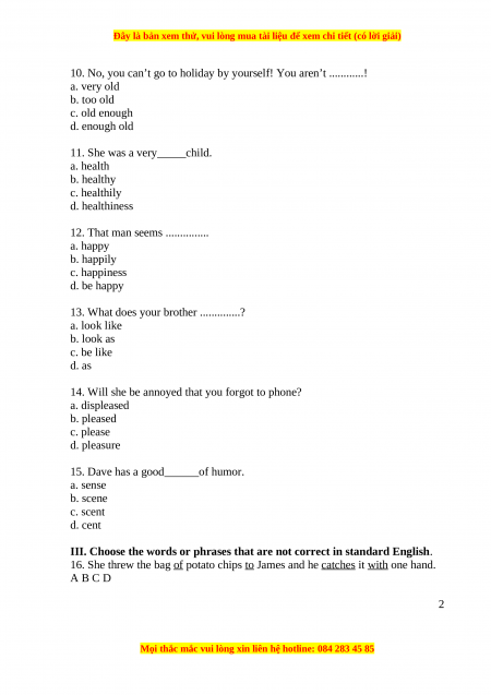 10. No, you can’t go to holiday by yourself! You aren’t ............! a. very old b. too old c. old enough d. enough old 11. She was a very_____child. a. health b. healthy c. healthily d. healthiness
