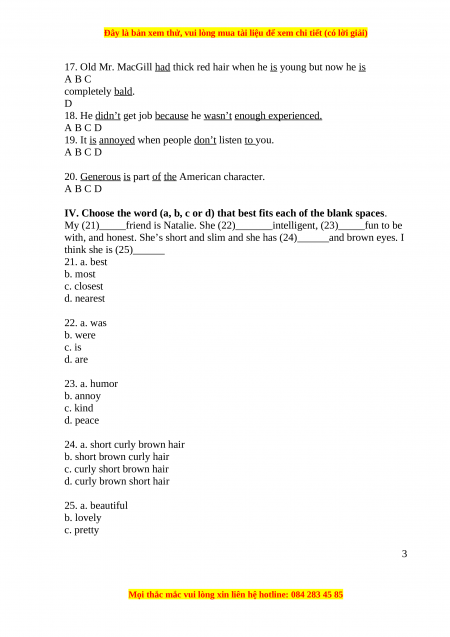 with, and honest. She’s short and slim and she has (24)______and brown eyes. I think she is (25)______ 21. a. best b. most c. closest d. nearest 22. a. was b. were c. is d. are 23. a. humor b. annoy c. kind d. peace 24. a. short curly brown hair b. short brown curly hair c. curly short brown hair d. curly brown short hair 25. a. beautiful b. lovely c. pretty 3