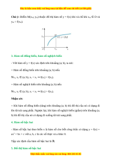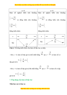 ∀x1, x2 ∈ (a; b), x1 < x2 ⇒ f(x1) > f(x2). Nh n ậ xét: + Khi hàm số đ n ồ g bi n ế (tăng) trên kho n ả g (a; b) thì đ ồ th ịc a ủ nó có d n ạ g đi lên t ừ trái sang ph i ả . Ngư c ợ l i ạ , khi hàm s ố ngh c ị h bi n ế (gi m ả ) trên kho n ả g (a; b) thì đ ồ th ịc a ủ nó có d n ạ g đi xu n ố g t ừ trái sang ph i ả . 4. Hàm số bậc hai - Hàm số b c ậ hai theo bi n ế x là hàm s ố cho b i ở công th c ứ có d ng ạ y = f(x) = ax2 + bx + c v i ớ a, b, c là các s t ố h c và a ự khác 0. T p xác ậ đ nh c ị a ủ hàm s b ố c ậ hai là . ℝ 5. Đồ th hàm ị số bậc hai M i ọ thắc m c