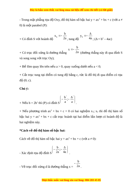 Đây là bản xem th , vu ử i lòng mua tài li u ệ đ xe ể m chi ti t ế (có l i ờ gi i ả ) - Trong m t ặ ph ng ẳ t a ọ đ O ộ xy, đ t ồ h hàm ị s ố b c ậ hai y = ax2 + bx + c (v i ớ a ≠ 0) là m t ộ parabol (P): b x y S S + Có đ nh S v ỉ i ớ hoành đ ộ 2a , tung đ ộ 4a ; (Δ = b2 – 4ac) b x + Có tr c ụ đ i ố x ng ứ là đư ng ờ th ng ẳ 2a (đư ng ờ th ng ẳ này đi qua đ nh ỉ S và song song v i ớ tr c O ụ y); + B l