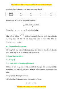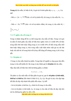 ệ thì số trung bình còn có thể bi u ể di n ễ là: x f x f x ... f x 1 1 2 2 k k . 6.2.Ý nghĩa c a s ủ ố trung bình Số trung bình c a ủ m u ẫ số li u ệ đư c ợ dùng làm đ i ạ di n ệ cho các số li u ệ c a ủ mẫu. Nó là m t ộ số đo xu th t ế rung tâm c a m ủ u đó. ẫ 7. Trung v và t ị phân v ứ ị 7.1. Trung v ị 7.1.1 Đ nh nghĩ ị a và cách tính s t ố rung v ị Khi các số li u ệ trong m u ẫ số li u ệ chênh l ch ệ nhau quá l n, ớ ta dùng m t ộ đ c ặ tr ng ư khác c a ủ m u ẫ số li u, ệ g i