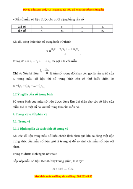 Đây là bản xem th , vu ử i lòng mua tài li u ệ đ xe ể m chi ti t (c ế ó l i ờ gi i ả ) • Giả s m ử ẫu số liệu đư c ợ cho dư i ớ d ng ạ b ng t ả n s ầ ố Giá trị x1 x2 … xk Tần số n1 n2 … nk Khi đó, công th c ứ tính s t ố rung bình tr t ở hành n x n x ... n x 1 1 2 2 k k x n .
