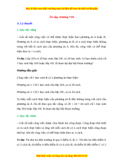 Đây là bản xem th , vu ử i lòng mua tài li u ệ đ xe ể m chi ti t ế (có l i ờ gi i ả ) Ôn tập chư ng ơ VIII A. Lý thuy t ế 1. Quy tắc c ng ộ – Giả sử m t ộ công vi c ệ có thể đư c ợ th c ự hi n ệ theo phư ng ơ án A ho c ặ B. Phư ng ơ án A có m cách th c ự hi n, ệ phư ng ơ án B có n cách th c ự hi n ệ không trùng v i ớ b t ấ kì cách nào c a ủ phư ng ơ án A. Khi đó, công vi c ệ có thể th c ự hiện theo m + n cách. Ví d : ụ L p ớ 10A có 20 h c ọ sinh, l p ớ 10C có 24 h c