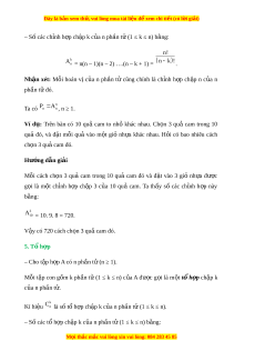 ọ 3 quả cam trong 10 quả cam đó và đ t ặ vào 3 giỏ nh a ự đư c ợ g i ọ là m t ộ ch nh ỉ h p ợ ch p ậ 3 c a ủ 10 quả cam. Ta th y ấ số các ch nh ỉ h p ợ này b ng: ằ 3 A10 = 10. 9. 8 = 720. V y ậ có 720 cách ch n 3 qu ọ cam ả đó. 5. Tổ h p ợ – Cho t p h ậ p ợ A có n ph n t ầ ( ử n ≥ 1). Mỗi t p ậ con g m ồ k ph n ầ t ử (1 ≤ k ≤ n) c a ủ A đư c ợ g i ọ là m t ộ tổ h p ợ ch p ậ k c a ủ n phần t . ử k Kí hi u ệ Cn là số tổ h p ch ợ p k c ậ a ủ n ph n t ầ ( ử 1 ≤ k ≤ n). – Số các tổ h p ch ợ p ậ k c a n ph ủ ần t ( ử 1 ≤ k ≤ n) b ng: ằ M i ọ thắc m c