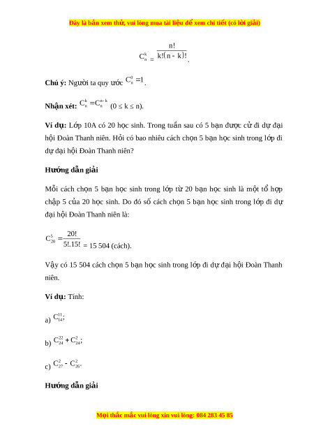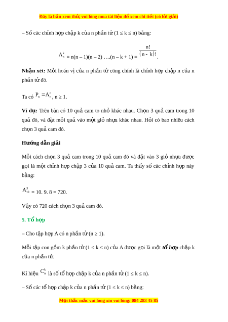 Đây là bản xem th , vu ử i lòng mua tài li u ệ đ xe ể m chi ti t (c ế ó l i ờ gi i ả ) – Số các chỉnh h p ch ợ p k c ậ a ủ n ph n t ầ ( ử 1 ≤ k ≤ n) b ng: ằ n! k A n k !