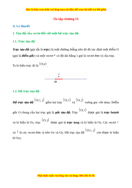 Đây là bản xem th , vu ử i lòng mua tài li u ệ đ xe ể m chi ti t ế (có l i ờ gi i ả ) Ôn t p ch ậ ư ng I ơ X A. Lý thuy t ế 1. T a ọ đ c ộ a vect ủ đ ơ i ố v i ớ m t ộ h t ệ r c t ụ a đ ọ ộ 1.1. Trục t a đ ọ ộ Trục t a ọ độ (g i ọ t t ắ là tr c ụ ) là m t ộ đư ng ờ th ng ẳ trên đó đã xác đ nh ị m t ộ đi m ể O (g i ọ là đi m ể g c ố ) và m t ộ vect ơ e có đ dài ộ b ng ằ 1 g i ọ là vectơ đ n v ơ ị c a t ủ r c. ụ Ta kí hiệu tr c ụ đó là O;e . 1.2. H t ệ r c t ụ a đ ọ ộ O; i, j O; i O; j Hệ tr c ụ t a ọ độ gồm hai tr c ụ và vuông góc v i ớ nhau. Đi m ể O; i gốc O chung c a ủ hai tr c ụ g i ọ là g c ố t a ọ đ . ộ Tr c ụ đư c ợ g i ọ là tr c ụ hoành O; j và kí hi u ệ là Ox, tr c ụ đư c ợ g i ọ là tr c