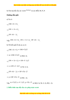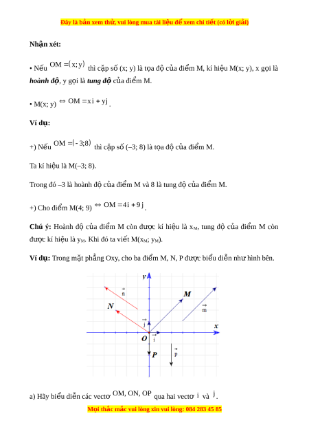 Chú ý: Hoành độ c a ủ đi m ể M còn đư c ợ kí hi u ệ là xM, tung độ c a ủ đi m ể M còn đư c ợ kí hi u l ệ à yM. Khi đó ta vi t ế M(xM; yM). Ví d : ụ Trong m t ặ ph ng ẳ Oxy, cho ba đi m ể M, N, P đư c ợ bi u di ể n nh ễ hì ư nh bên. a) Hãy bi u di ể n các ễ vect ơ OM, ON, OP qua hai vect ơ i và j . M i