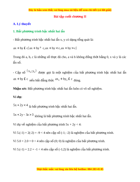 Đây là bản xem th , vu ử i lòng mua tài li u ệ đ xe ể m chi ti t (c ế ó l i ờ gi i ả ) Bài tập cu i ố chư ng I ơ I A. Lý thuy t ế 1. Bất phư ng ơ trình b c n ậ h t ấ hai n ẩ - Bất phư ng t ơ rình b c nh ậ t ấ hai n x, y có d ẩ ng ạ t ng quát ổ là: