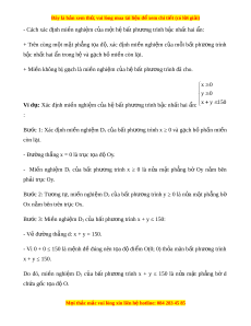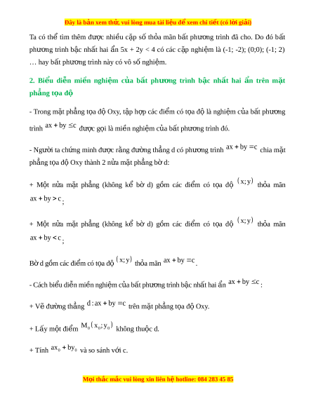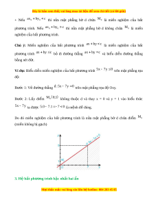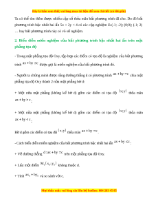 ệ là (-1; -2); (0;0); (-1; 2) … hay bất phư ng ơ trình này có vô s nghi ố m ệ . 2. Bi u ể di n ễ mi n ề nghi m ệ c a ủ b t ấ phư ng ơ trình b c ậ nh t ấ hai n ẩ trên m t ặ phẳng t a đ ọ ộ - Trong m t ặ ph n ẳ g t a ọ đ ộ Oxy, t p ậ h p ợ các đi m ể có t a ọ đ ộ là nghi m ệ c a ủ b t ấ phư n ơ g trình ax by c đư c ợ g i ọ là mi n ề nghi m ệ c a ủ b t ấ phư n ơ g trình đó. - Ngư i ờ ta ch n ứ g minh đư c ợ r n ằ g đư n ờ g th n ẳ g d có phư n ơ g trình ax by c chia m t ặ ph n ẳ g t a ọ đ ộ Oxy thành 2 n a ử m t ặ ph n ẳ g b ờ d: + M t ộ n a ử m t ặ ph n ẳ g (không kể bờ d) g m ồ các đi m ể có t a ọ độ x; y th a ỏ mãn ax by c ; + M t ộ n a ử m t ặ ph n ẳ g (không kể bờ d) g m ồ các đi m ể có t a ọ độ x; y th a ỏ mãn ax by c ; B ờ d g m ồ các đi m ể có t a ọ đ ộ x;y th a ỏ mãn ax by c . - Cách bi u ể di n ễ mi n ề nghi m ệ c a ủ b t ấ phư n ơ g trình b c ậ nh t ấ hai n ẩ ax by c : + V ẽ đư n ờ g th n ẳ g d : ax by c trên m t ặ ph n ẳ g t a ọ đ ộ Oxy. + L y ấ m t ộ đi m ể M x ; y 0 0 0 không thu c ộ d. + Tính ax by 0 0 và so sánh v i ớ c. M i