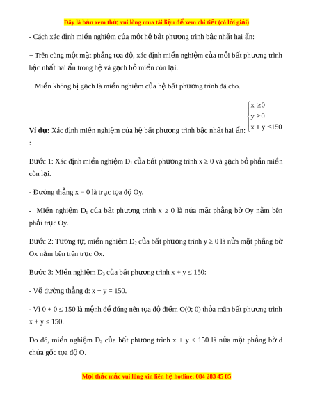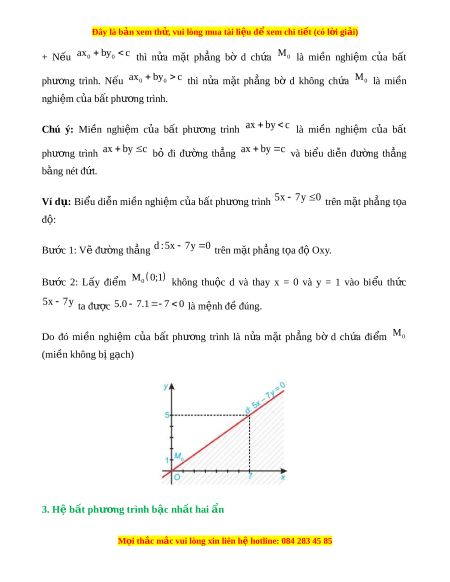 Đây là bản xem th , vu ử i lòng mua tài li u ệ đ xe ể m chi ti t (c ế ó l i ờ gi i ả ) + N u ế ax by c M 0 0 thì n a ử m t ặ ph n ẳ g bờ d ch a ứ 0 là mi n ề nghi m ệ c a ủ b t ấ phư n ơ g trình. N u ế ax by c M 0 0 thì n a ử m t ặ ph n ẳ g bờ d không ch a ứ 0 là mi n ề nghi m ệ c a ủ b t ấ phư n ơ g trình. Chú ý: Mi n ề nghi m ệ c a ủ b t ấ phư n