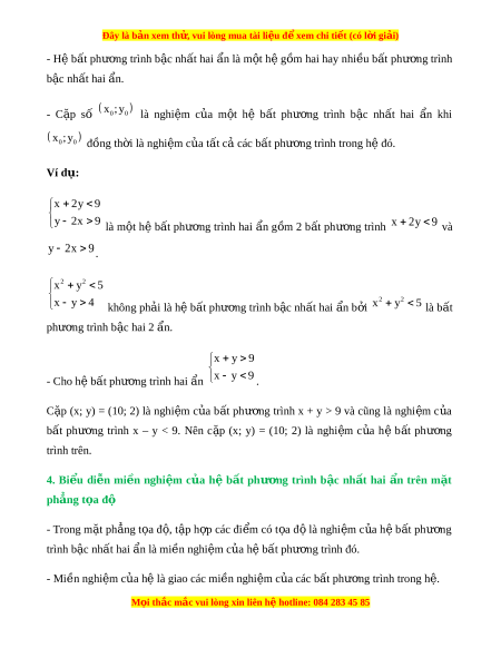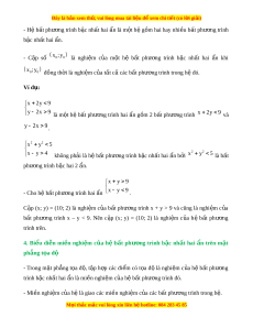 Đây là bản xem th , vu ử i lòng mua tài li u ệ đ xe ể m chi ti t (c ế ó l i ờ gi i ả ) - H ệ b t ấ phư ng ơ trình b c ậ nh t ấ hai n ẩ là m t ộ h g ệ m ồ hai hay nhi u b ề t ấ phư ng t ơ rình b c ậ nh t ấ hai n. ẩ - C p ặ số x ;y 0 0 là nghi m ệ c a ủ m t ộ hệ b t ấ phư ng ơ trình b c ậ nh t ấ hai n ẩ khi x ; y 0 0 đồng th i ờ là nghi m ệ c a t ủ t ấ cả các b t ấ phư ng t ơ rình trong h đó. ệ Ví d : ụ x 2y 9 y 2x 9 là m t ộ hệ b t ấ phư ng ơ trình hai n ẩ g m ồ 2 b t ấ phư ng ơ trình x 2y 9 và y 2x 9 . 2 2 x y 5 x y 4 2 2 không ph i ả là hệ b t ấ phư ng ơ trình b c ậ nh t ấ hai n ẩ b i ở x y 5 là b t ấ phư ng ơ trình b c ậ hai 2 n. ẩ x y 9 - Cho h b ệ t ấ phư ng t ơ rình hai n ẩ x y 9 . C p