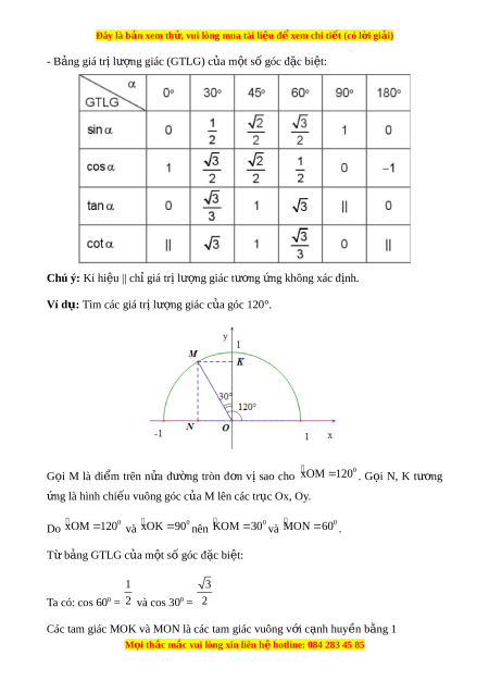 ụ Tìm các giá tr l ị ư ng gi ợ ác c a góc 120°. ủ G i ọ M là đi m ể trên n a ử đư ng ờ tròn đ n ơ vị sao cho 0 xOM 1 20 . G i ọ N, K tư ng ơ ng l ứ à hình chi u ế vuông góc c a M ủ lên các tr c O ụ x, Oy. Do 0 xOM 12 0 và 0 xOK 90 nên 0 KOM 30 và 0 MON 6 0 . T b ừ ng G ả TLG c a m ủ t ộ s góc ố đ c bi ặ t ệ : 1 3