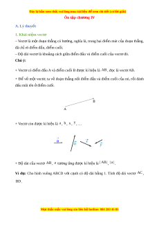 Đây là bản xem th , vu ử i lòng mua tài li u ệ đ xe ể m chi ti t (c ế ó l i ờ gi i ả ) Ôn t p ch ậ ư ng I ơ V A. Lý thuy t ế 1. Khái ni m ệ vectơ – Vectơ là m t ộ đo n ạ th ng ẳ có hư ng, ớ nghĩa là, trong hai đi m ể mút c a ủ đo n ạ th ng, ẳ đã chỉ rõ đi m ể đ u, đi ầ m ể cu i ố . – Độ dài vect l ơ à kho ng ả cách gi a ữ đi m ể đ u và đi ầ m ể cu i ố c a ủ vect đó. ơ Chú ý: