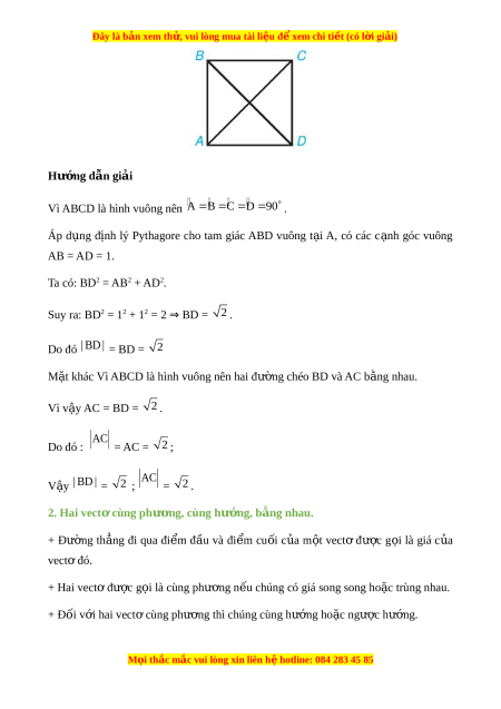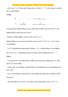 AC Do đó : = AC = 2 ; AC V y ậ | BD | = 2 ; = 2 . 2. Hai vect cùng ph ơ ư ng, cùng h ơ ư ng, ớ b ng nhau. ằ + Đư ng ờ th ng ẳ đi qua đi m ể đ u ầ và đi m ể cu i ố c a ủ m t ộ vect ơ đư c ợ g i ọ là giá c a ủ vectơ đó. + Hai vectơ đư c g ợ i ọ là cùng phư ng n ơ u chúng ế có giá song song ho c ặ trùng nhau. + Đối v i ớ hai vectơ cùng phư ng t ơ hì chúng cùng hư ng ớ ho c ng ặ ược hư ng. ớ M i ọ thắc m c