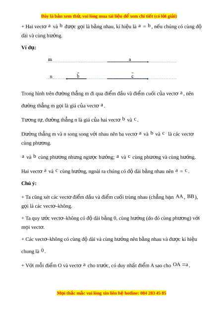 Đây là bản xem th , vu ử i lòng mua tài li u ệ đ xe ể m chi ti t (c ế ó l i ờ gi i ả ) + Hai vectơ a và b đư c g ợ i ọ là b ng nhau, kí ằ hi u l ệ à a = b , n u chúng ế có cùng độ dài và cùng hư ng. ớ Ví d : ụ Trong hình trên đư ng t ờ h ng ẳ m đi qua đi m ể đ u và đi ầ m ể cu i ố c a vect ủ ơ a , nên đư ng ờ th ng m ẳ g i ọ là giá c a ủ vect ơ a . Tư ng t ơ , đ ự ư ng ờ th ng n l ẳ à giá c a ủ hai vect ơ b và c . Đư ng ờ th ng m ẳ và n song song v i ớ nhau nên ba vect